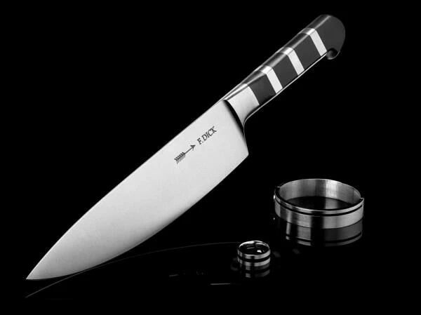 Dick Messerserie 1905 verbindet klassisches Design mit modernster Technologie, höchstem Hygieneniveau sowie exzellenter Qualität und Funktionalität. Die ebenmäßigen Stahlringe werden durch ein einzigartiges Verfahren untrennbar mit dem Kunststoff verbunden. Alle Messer der Serie Dick 1905 sind optimal ausbalanciert und verjüngen sich zur Spitze. Die Klingen werden aus dem von Spitzenköchen bevorzugten deutschen Edelstahl XCrMoVMn gefertigt und schlank angeschliffen. Durch ein hochtechnologisches Härteverfahren bei Temperaturen von ca. 1060° C und einer Tieftemperaturbehandlung von bis zu -190° C wird eine Härte über 60 HRc erzielt. Gezieltes Anlassen in mehreren Schritten bei ca. 200° C ermöglicht eine einzigartige, dynamische und scharfe Schneide der Dick Messer 1905. Die Härte wird dabei schonend auf 55 HRc gebracht. Dieser besondere Härtegrad gewährleistet einerseits die Schärfe und Schnitthaltigkeit, lässt andererseits aber noch das einfache Nachschärfen zu.