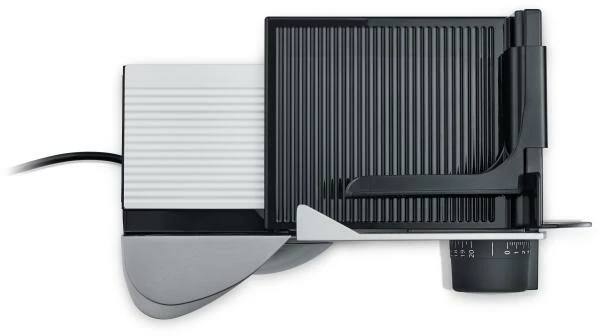Schneidemaschine im cleanen Silberlook. Kann platzsparend verstaut werden. Ansprechend im Set mit Küchenwaage und MiniSlice-Aufsatz.