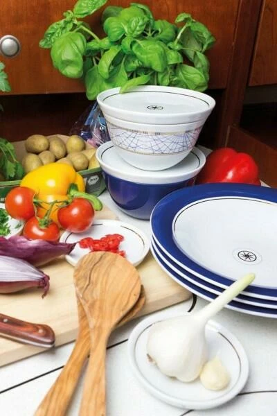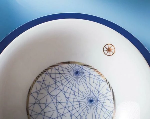 Die zwei eleganten und maritimen Dekore in Dunkelblau und Gold können nach Belieben miteinander oder dem weißen Dekor kombiniert werden. So kann der kleine Snackteller sowohl als Untersetzer als auch als Deckel für die Tassen und Schalen verwendet werden.