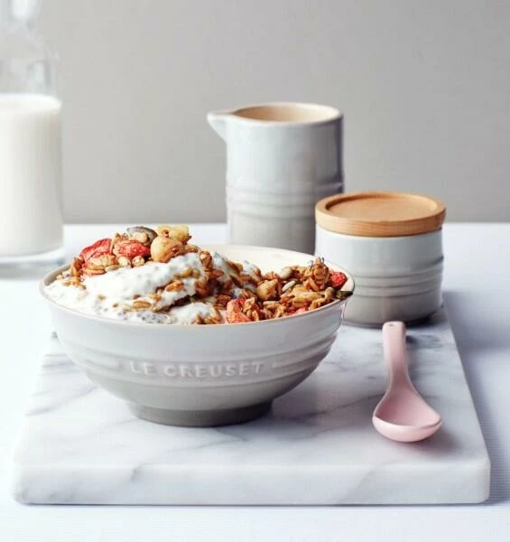 Le Creuset Müslischüssel in perlgrau. Egal ob Cornflakes, Müsli oder frischer Obstsalat mit dieser stilvollen und formschönen Müslischüssel starten Sie gut in den Tag.