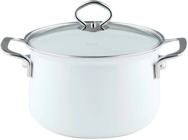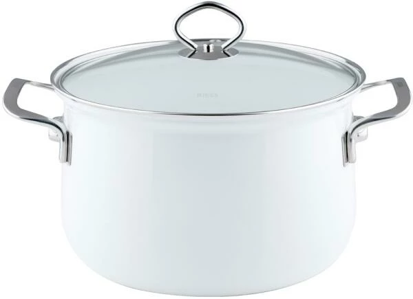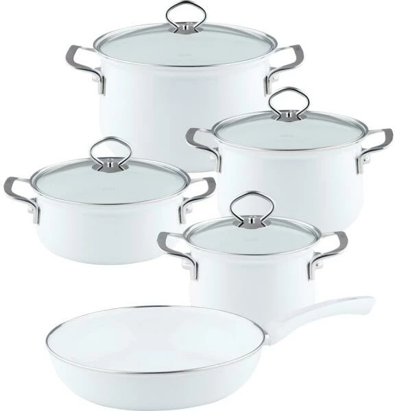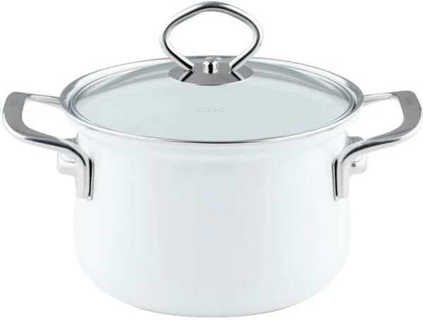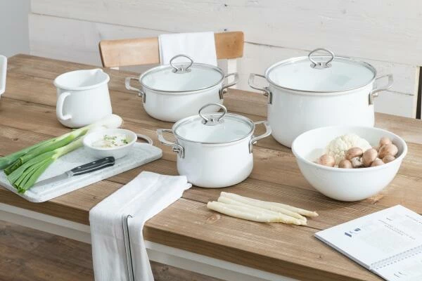 Riess Geschirr-Set aus Emaille, 5-tlg. in arctic weiß. 4 Töpfe und 1 Pfanne aus Emaille, Edelstahl und Glas.