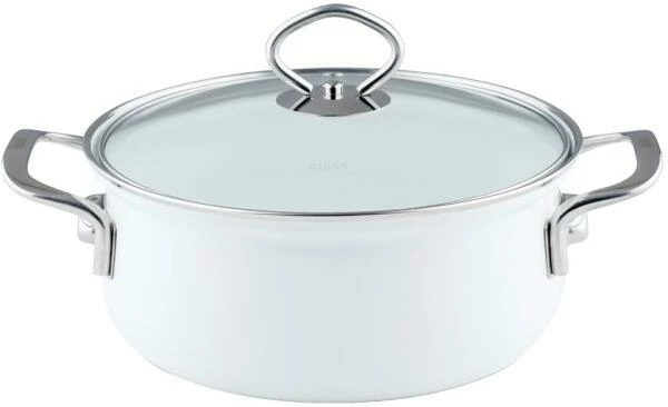 Die Töpfe überzeugen durch eine ideale Kombination verschiedener hochwertiger Materialien. Die Emaille ist schnitt- und kratzfest, leitet die Wärme gleichmäßig und schnell weiter und ist dank porenloser, glatter Oberfläche leicht zu reinigen sowie aromaneutral. Die Design-Griffe aus Edelstahl sind praktisch und auch ohne Handschuhe zu berühren. Dank des Glasdeckels ist das Kochgut leicht und einfach im Auge zu behalten. Die Ausnahme bildet der Griff der Pfanne, der besteht aus einem klassisch weißen Kunststoffgriff.