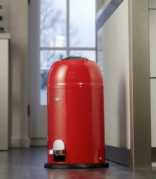 Wesco Single Master in Edelstahl, 9 Liter. Das Besondere: Die Öffnung oben. Sie schließt geruchs- und geräuscharm und wird über eine robuste Tretmechanik bedient.